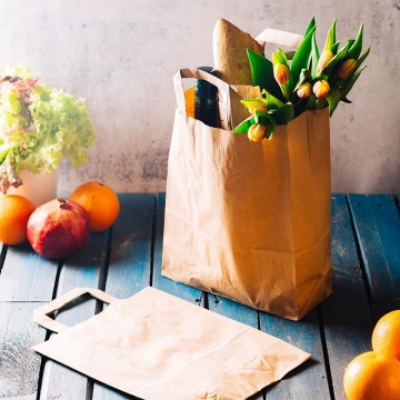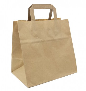 Paper bags with flat handles are a beautiful, convenient and reliable packaging material for Take-Away and To-Go business. Bags are used for food, especially common in cafes and restaurants for takeaway food. Carrier paper bags are made of high-quality environmentally friendly craft. Such paper bag can withstand up to 12 kg of load, practically it has no restrictions on filling. Paper handles are very high quality and securely glued to the bag.